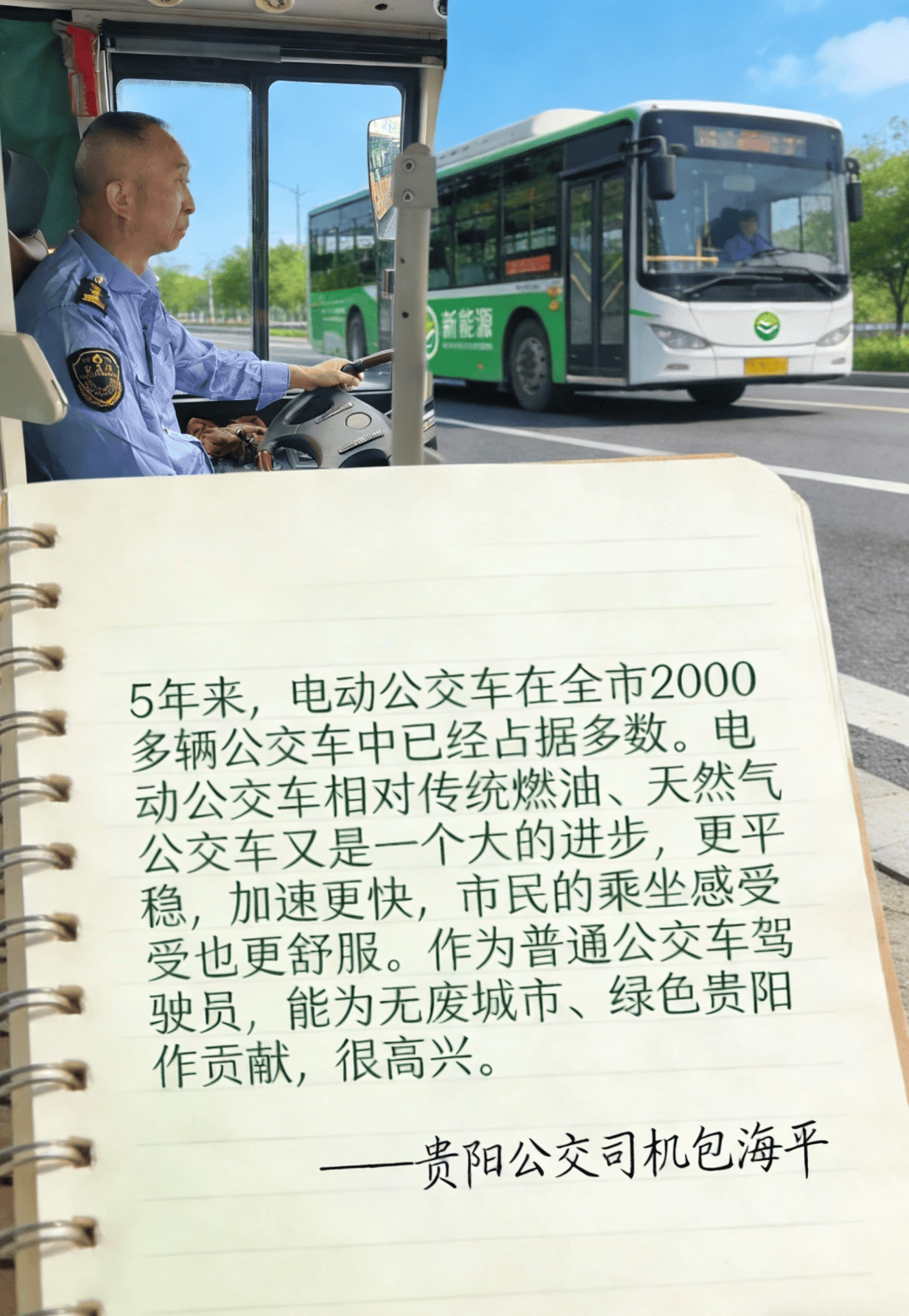 我叫包海平,是贵阳市公交公司的一位司机,开了20多年公交车,经历了贵阳市的汽柴油公交车、天然气公交车和电动公交车三个阶段,目睹了贵阳公交车从污染环境到零污染、为改善城市空气质量作出的每一分努力。